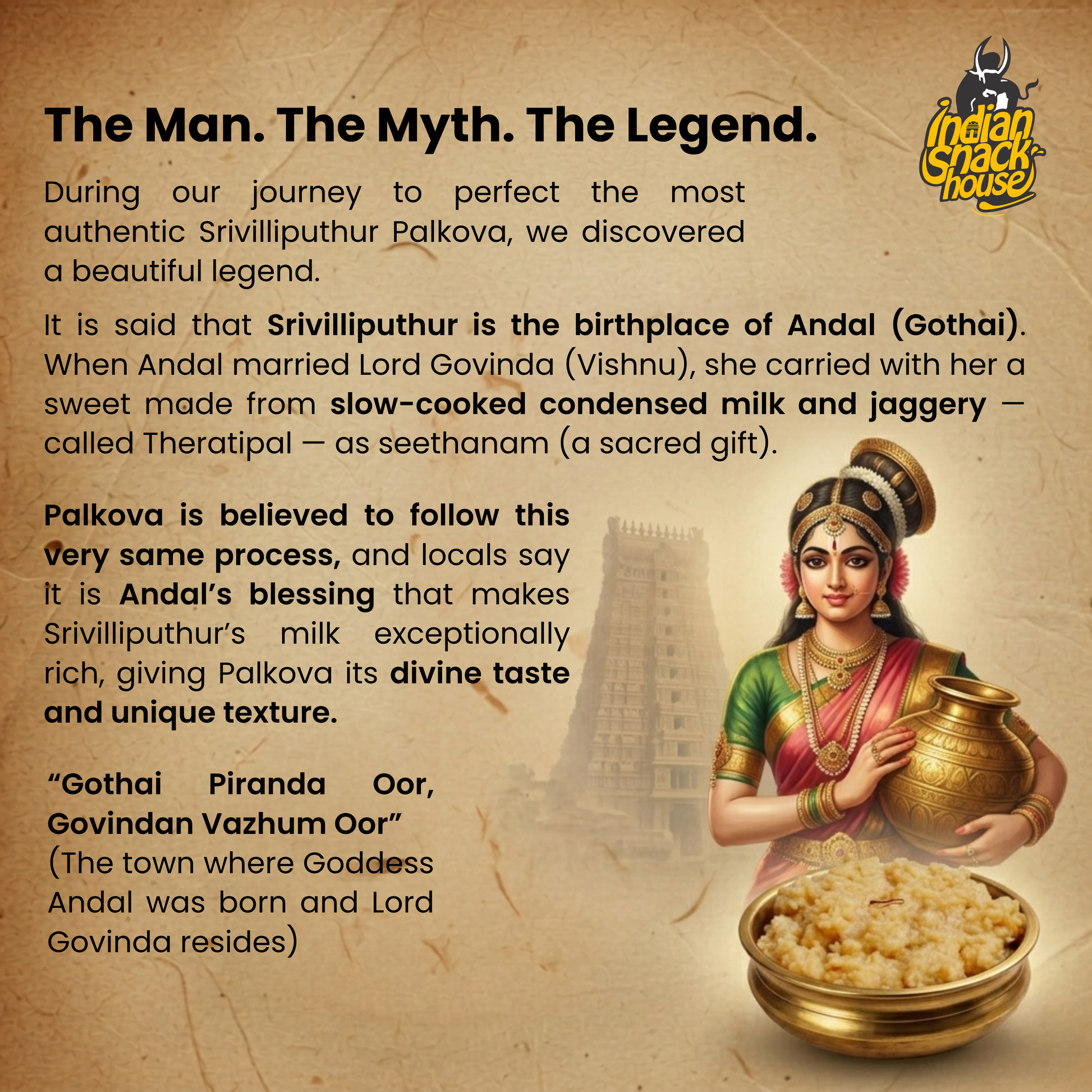 What sets our Palkova apart is its traditional preparation—milk is slow-cooked to perfection, carefully condensed, and sweetened, embodying the time-honored culinary methods of Srivilliputtur artisans.
